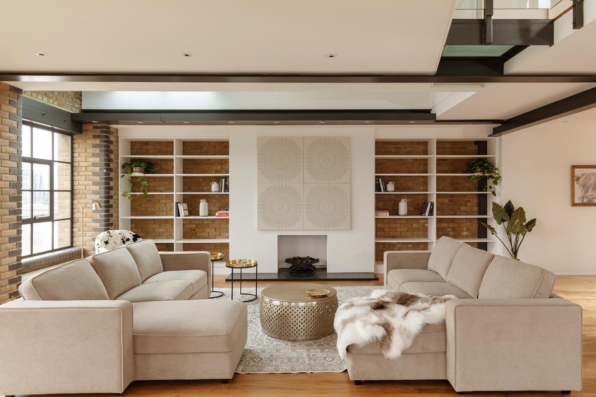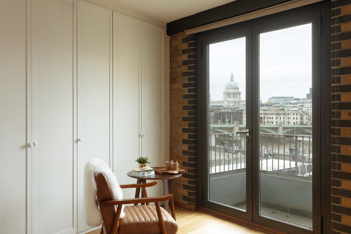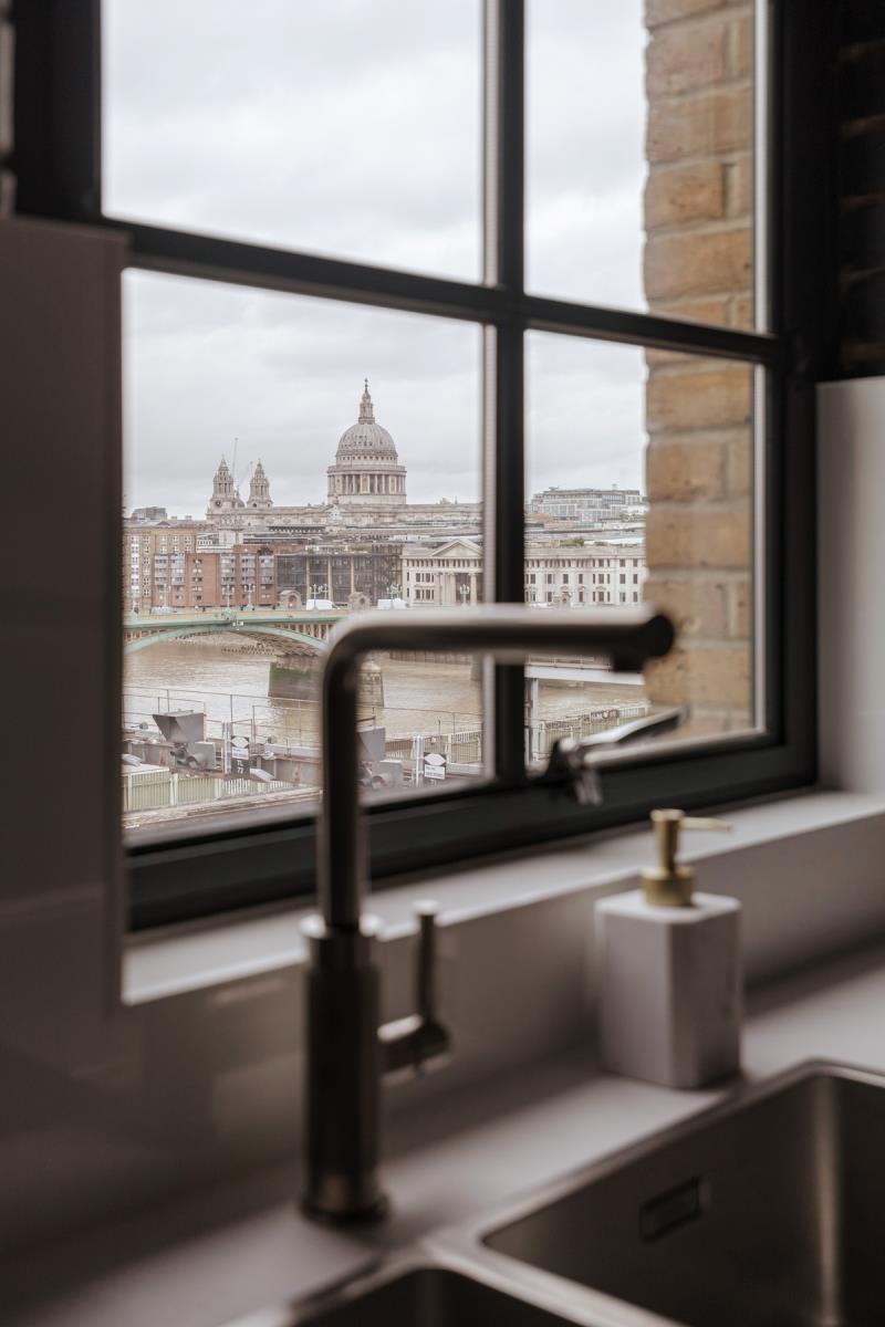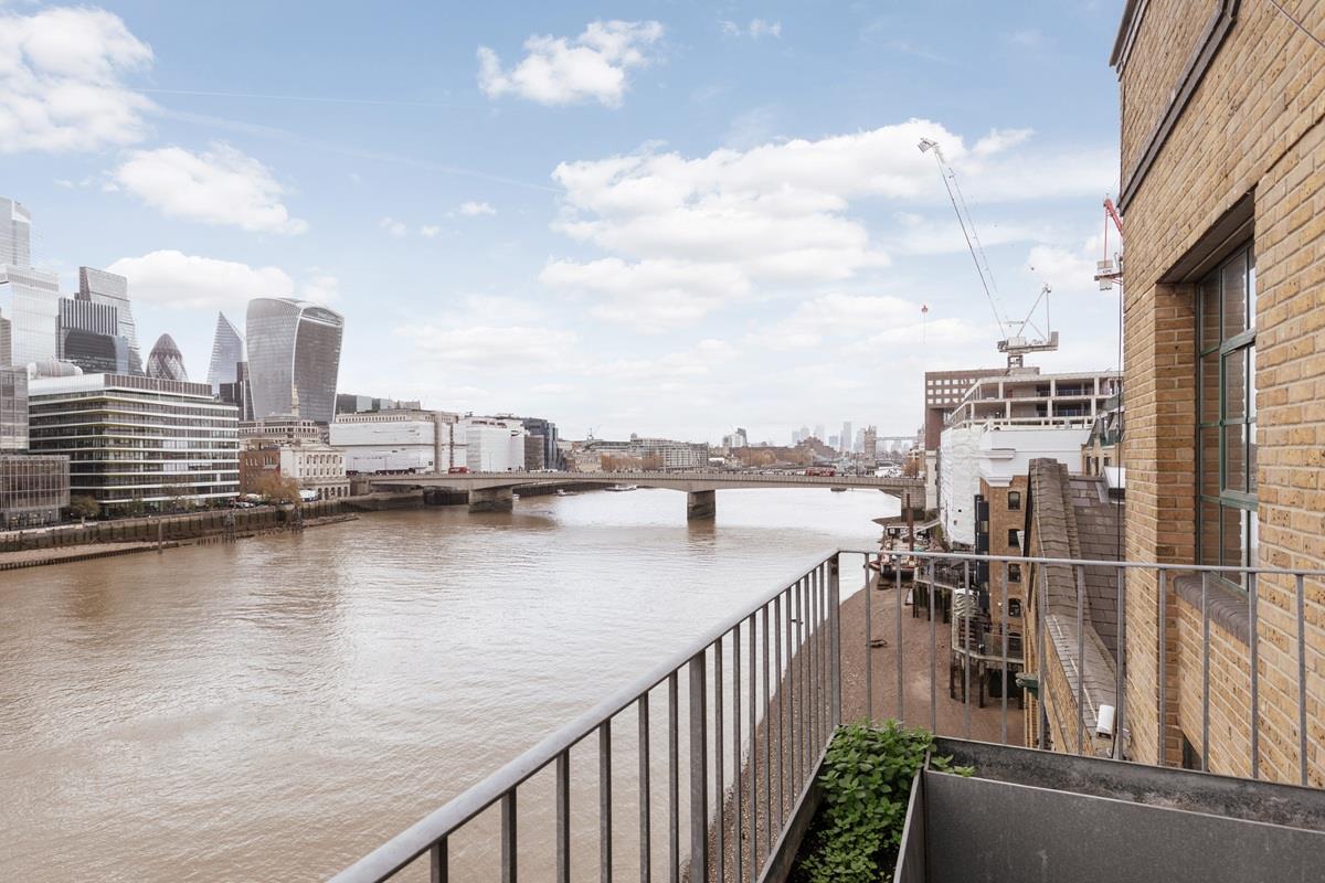 The kitchen is well equipped with high end appliances including a Falcon Range Cooker and plenty of cupboards and storage space and wonderful river views. Onto the vast main reception space, part of which is part double height and bathed in sunlight from the high ceilings and dual north and west facing windows, making a dramatic feature in this already impressive space, it also has west and north facing balconies with views which include St Pauls Cathedral and The City (including The Gerkin, Walkie Talkie building etc)
