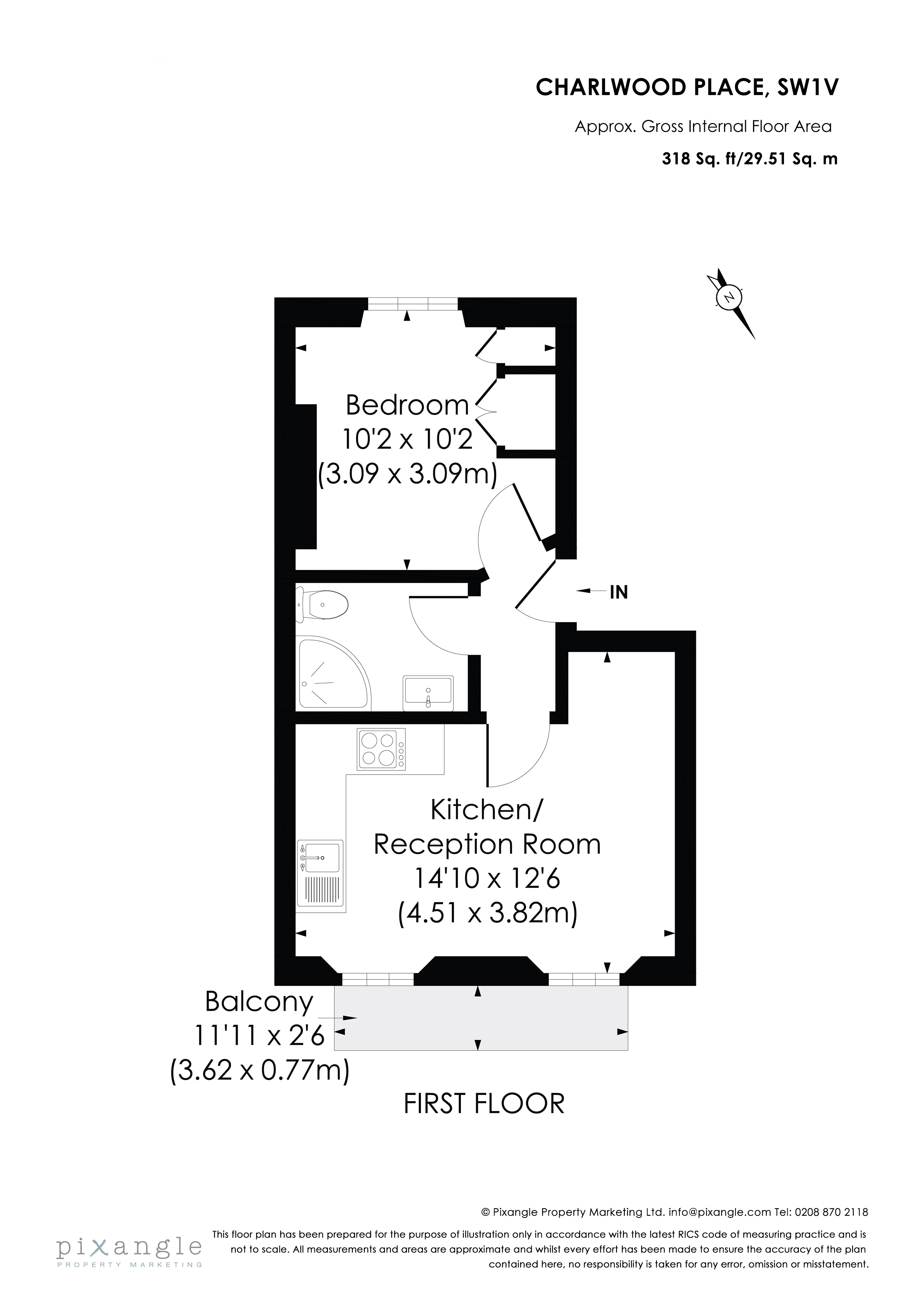 The property comprises a bright and spacious reception room with kitchen and private balcony, good sized bedroom with fitted wardrobe and storage space, bathroom with shower.